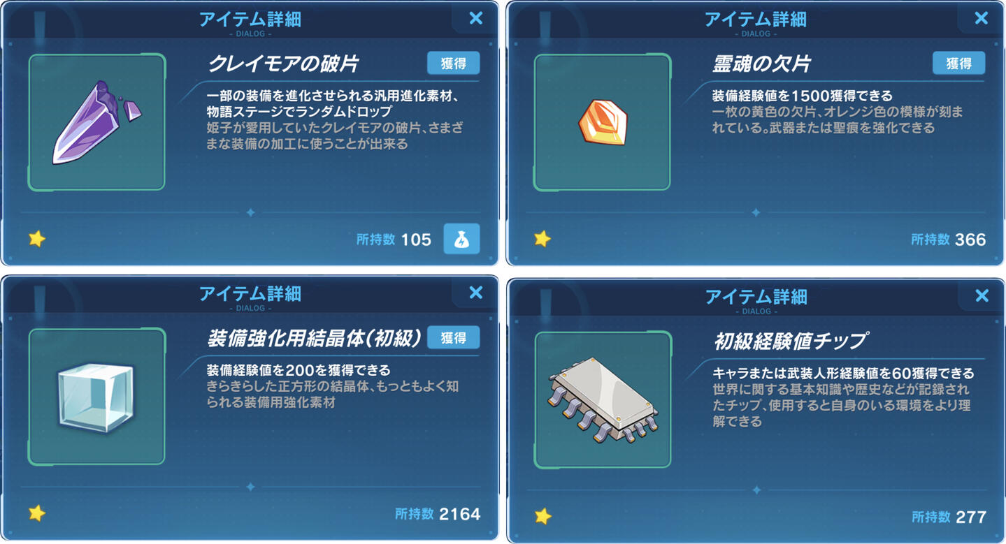 ☆3以上の武器・聖痕を使うようになったら使わなくなるが、獲得の機会が限られているので余るほどではない霊魂の欠片 装備強化用結晶体(初級)